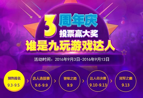 颜好不用藏,技高秀出来!9月3日-9月13日,值此手盟网络旗下手游平台-九玩游戏3周年之际,特面向全平台玩家推出“九玩游戏达人”评选活动!0门槛,高奖励,只要够自信,人人都有机会!