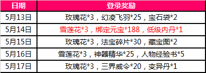 活动奖励:连续5天累计登录奖励:高级内丹*1