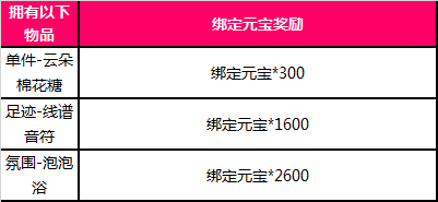 1、活动期间购买以上套装、足迹、氛围,或在活动开启前已经拥有以上道具物品(但需保证活动结束时依然拥有上述物品),均可参与本次活动,按活动要求获得对应绑定元宝奖励;
