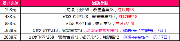 例:小仙在5月12日-5月14日活动期间,总累计充值金额达2888元,那么活动结束后小仙可获得:幻凌飞羽*850、驭兽宝典*18、银元宝*8、驭兽古卷*6、珍奇宠物技能书*1、烛阴镯*2、红玫瑰*26、雪莲花*28、称谓-买了本假书(7日)*1、称谓-先充ta个一亿(7日)*1,等全部奖励内容。