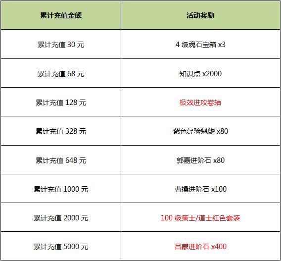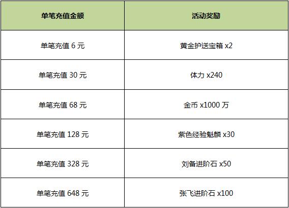 活动内容:活动期间,单笔充值金额满足以下条件即可获得相应奖励一份,多次充值可以多次领取相应奖励!