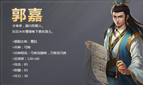 字奉孝,颍川阳翟人。东汉末年曹操帐下著名谋士。郭嘉虽然早逝,然而在早年曹操与袁绍的对抗中,郭嘉献策曹操奇袭袁军在乌巢的粮仓,继而击溃袁军主力,此战奠定了曹操统一中国北方的基础。官渡之战以弱胜强,以一敌十,此战流传后世,堪称是东汉末年的“三大战役”。