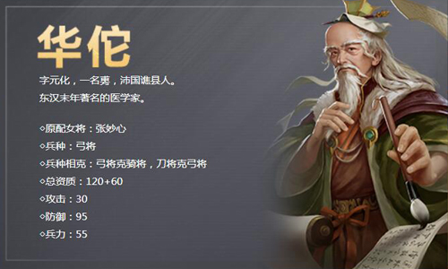 字元化,一名旉,沛国谯县人。东汉末年著名的医学家。与董奉、张仲景并称为“建安三神医”。他医术全面,尤其擅长外科,精于手术,并精通内、妇、儿、针灸各科。晚年因遭曹操怀疑,下狱被拷问致死。
