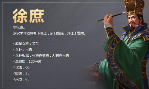 字元直。东汉末年刘备帐下谋士,后归曹操,并仕于曹魏。徐庶因被曹操骗至曹营,决心终生不献一策,心中虽似明镜,但始终不发一言,不对局势做出任何贡献,然而对于曹操来说,这样的玩家虽然不能帮助自己,亦不能帮助好人阵营,身为狼人阵营的曹氏军团,非常乐于见到这样的状况,不在乎多一个朋友,更在乎少一个敌人!