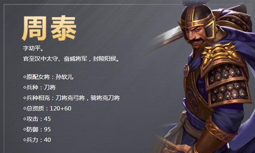 字幼平,九江下蔡人,三国时期吴国武将。在孙策平定江东时与同郡蒋钦一起加入孙策军,随孙策左右。周泰多次于战乱当中保护孙权的安危,后孙权为表彰周泰功绩,而赐予他青罗伞盖。官至汉中太守、奋威将军,封陵阳侯。