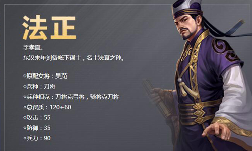 法正,字孝直,扶风郿(今陕西省眉县小法仪镇)人。东汉末年刘备帐下谋士,名士法真之孙。原为刘璋部下,刘备围成都时劝说刘璋投降,而后又与刘备进取汉中,献计将曹操大将夏侯渊斩首。法正善奇谋,深受刘备信任和敬重。