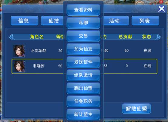 盟主可设置加入仙盟的条件、设置成员的职务、解散仙盟。