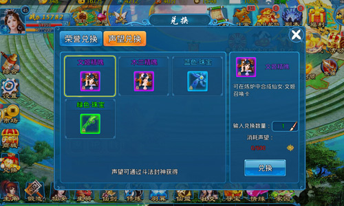 当然,壕气冲天的兑换系统可不仅限使用荣誉来进行兑换,还可以使用武器副本产生的仙玉,来兑换武器升级时所需要的图纸和材料。另外,在参与挑战斗法封神时获得的声望,也可以用于兑换仙女神交材料,仙女-文姬的精魄、仙女-昭君的精魄也在此获取哦!