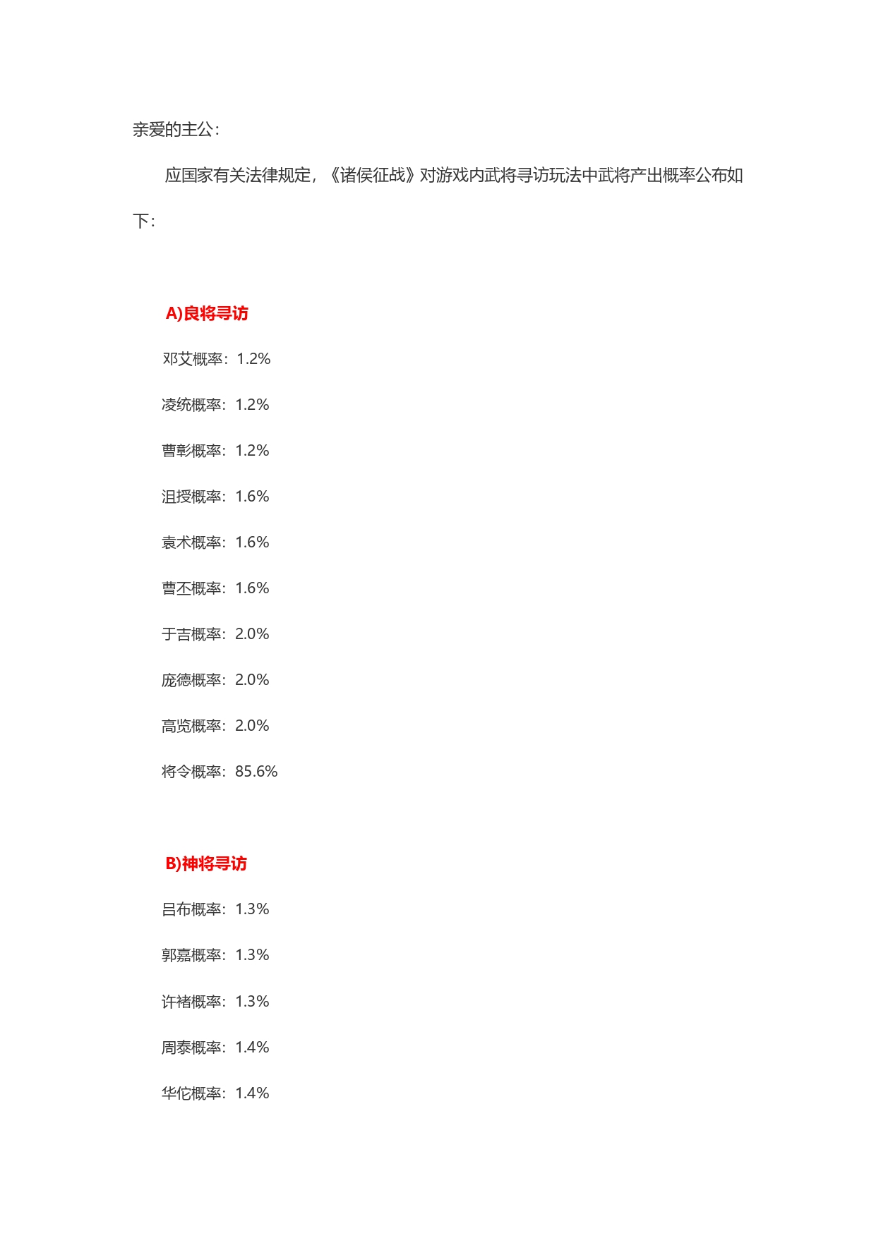《诸侯征战》手游随机抽取类玩法概率公示(更新)