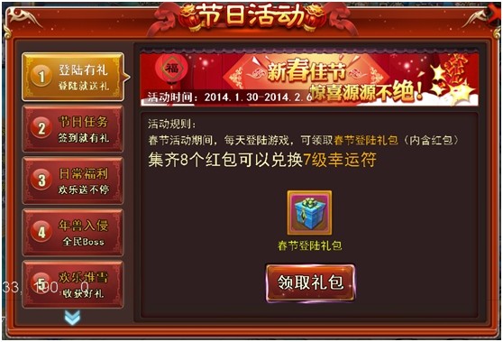 1. 活动期间,每天登陆游戏,可以领取春节登陆礼包,包含红包1个。